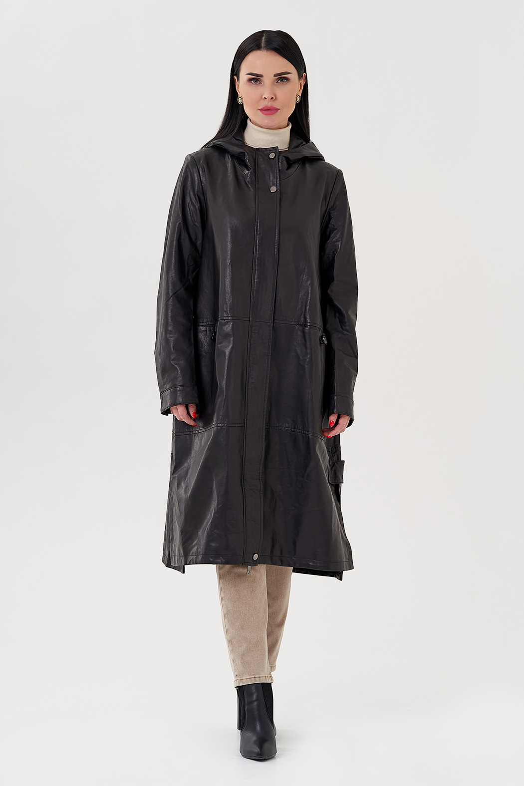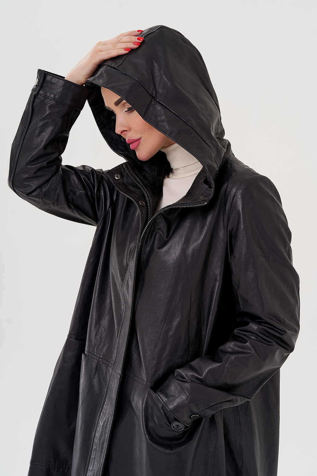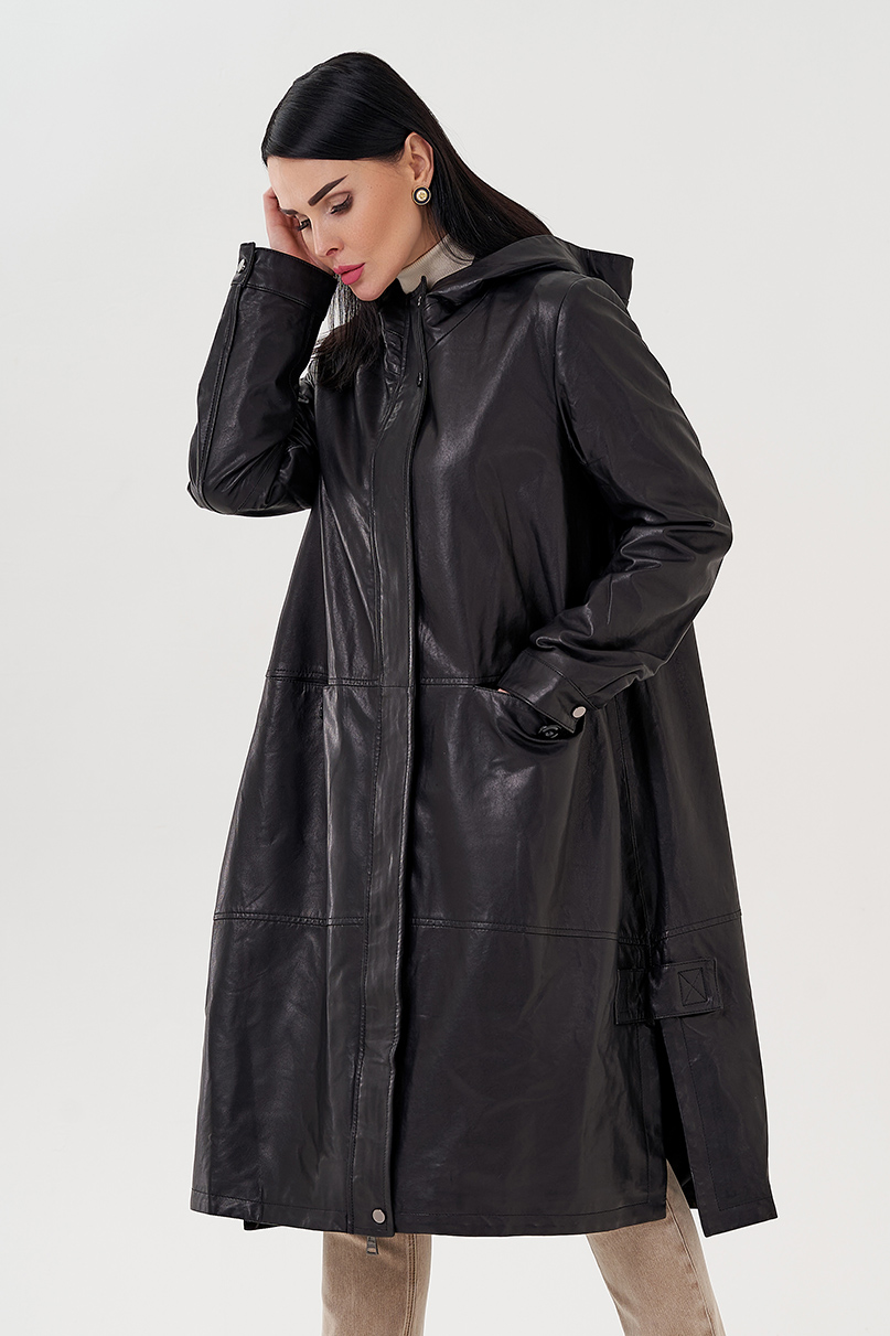 Длинный кожаный плащ с капюшоном