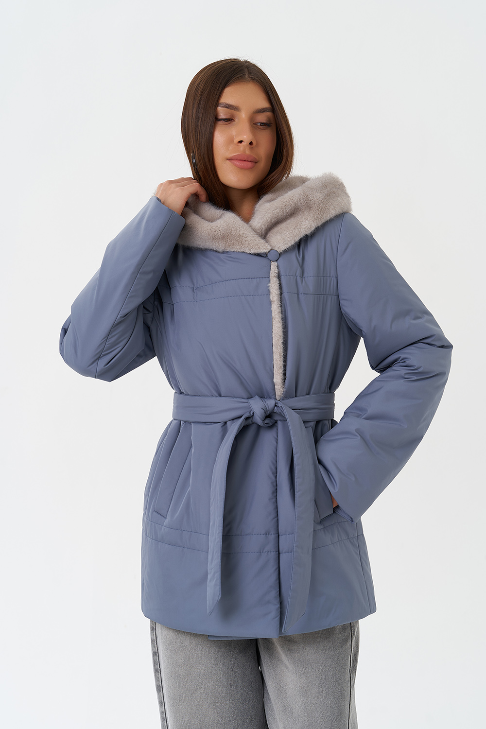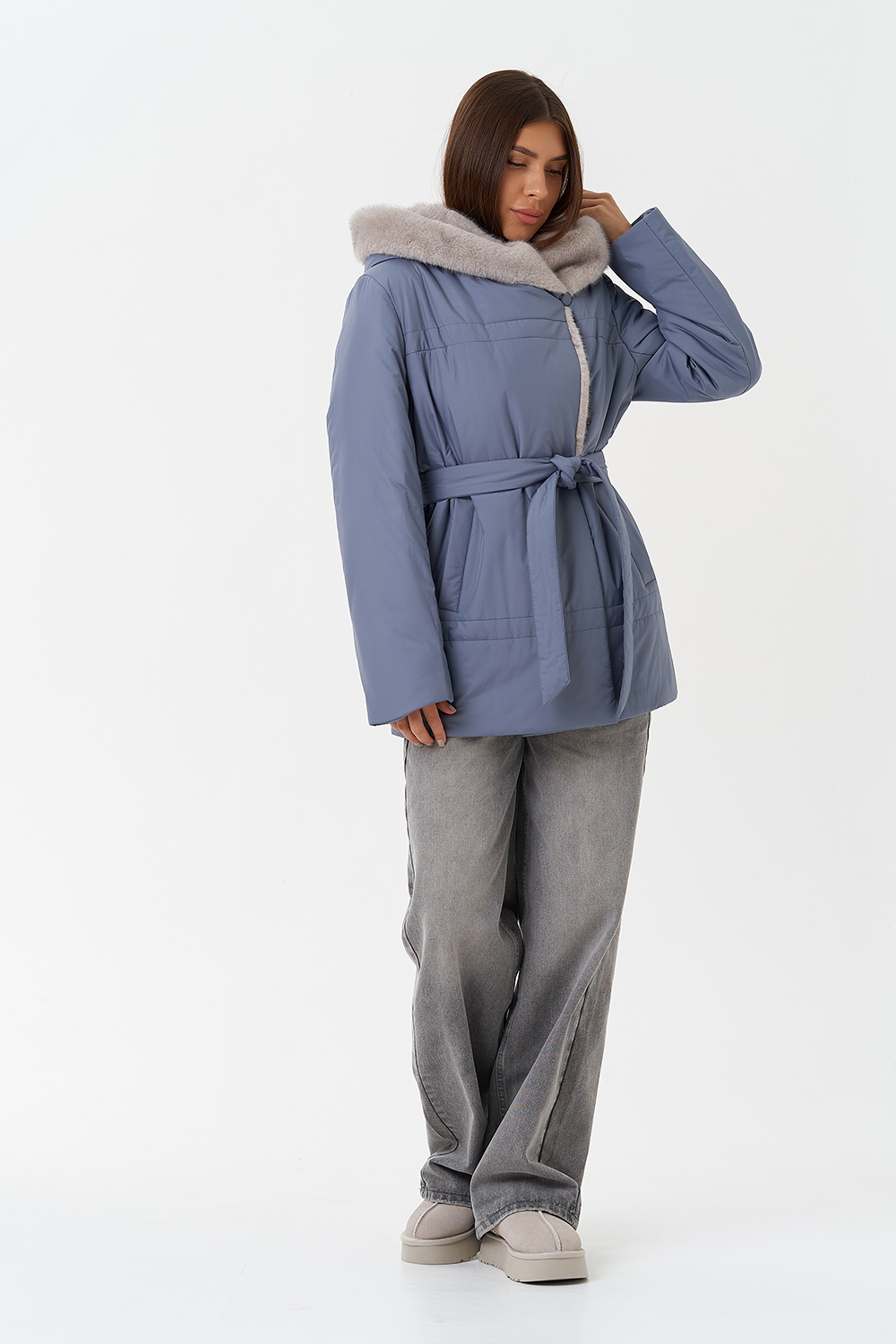 Крой воротника - капюшон, отделка эко мех под норку